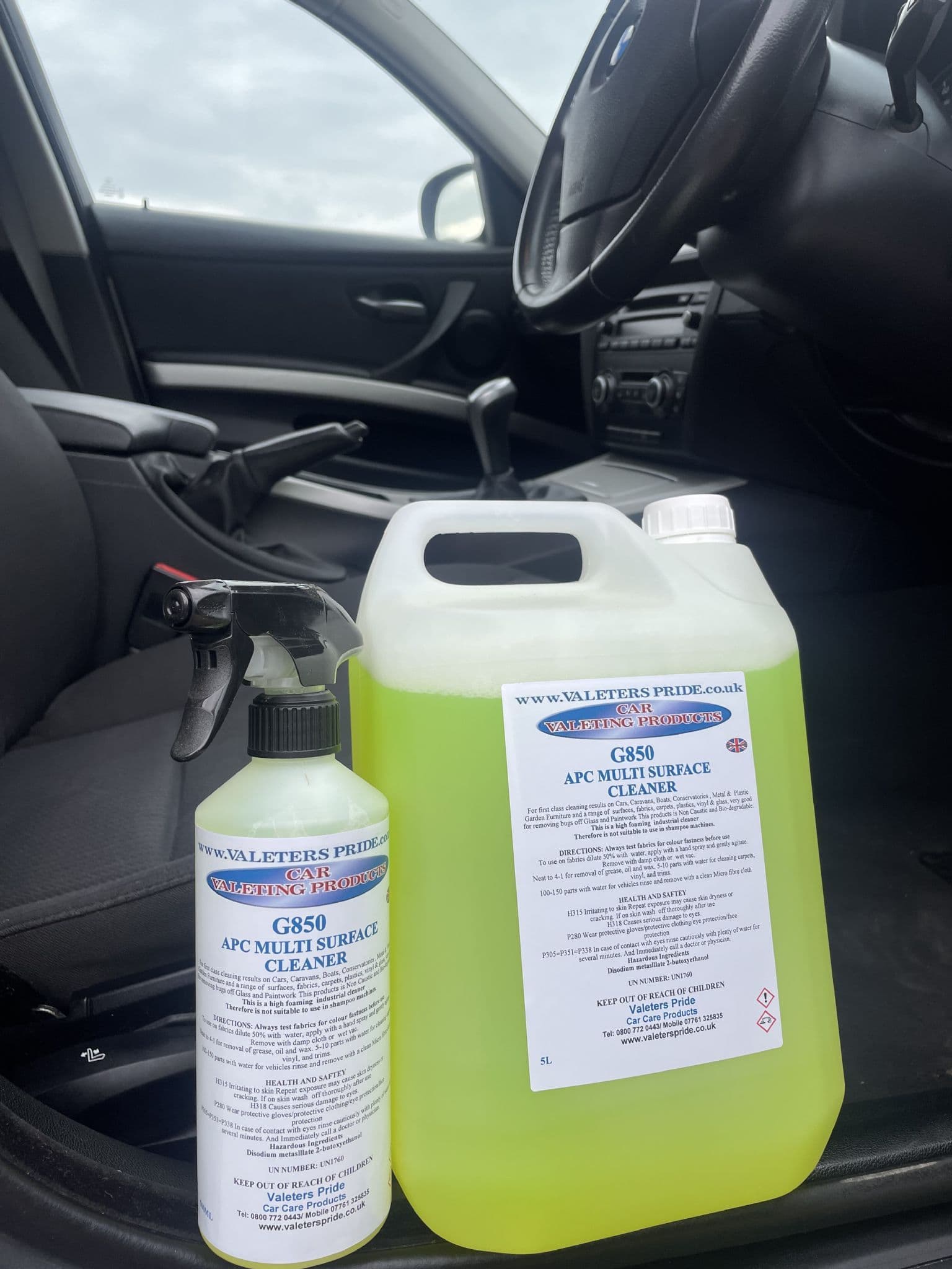 APC an industrial cleaner suitable to use on vehicle paintwork, fabrics, carpets, floors, worktops. G850 contains high foaming alkaline cleaning agents to remove waxes, oil, grease, traffic film, algae, watermarks and stubborn stains on Cars Vans, Caravans, Motorhomes & Boats